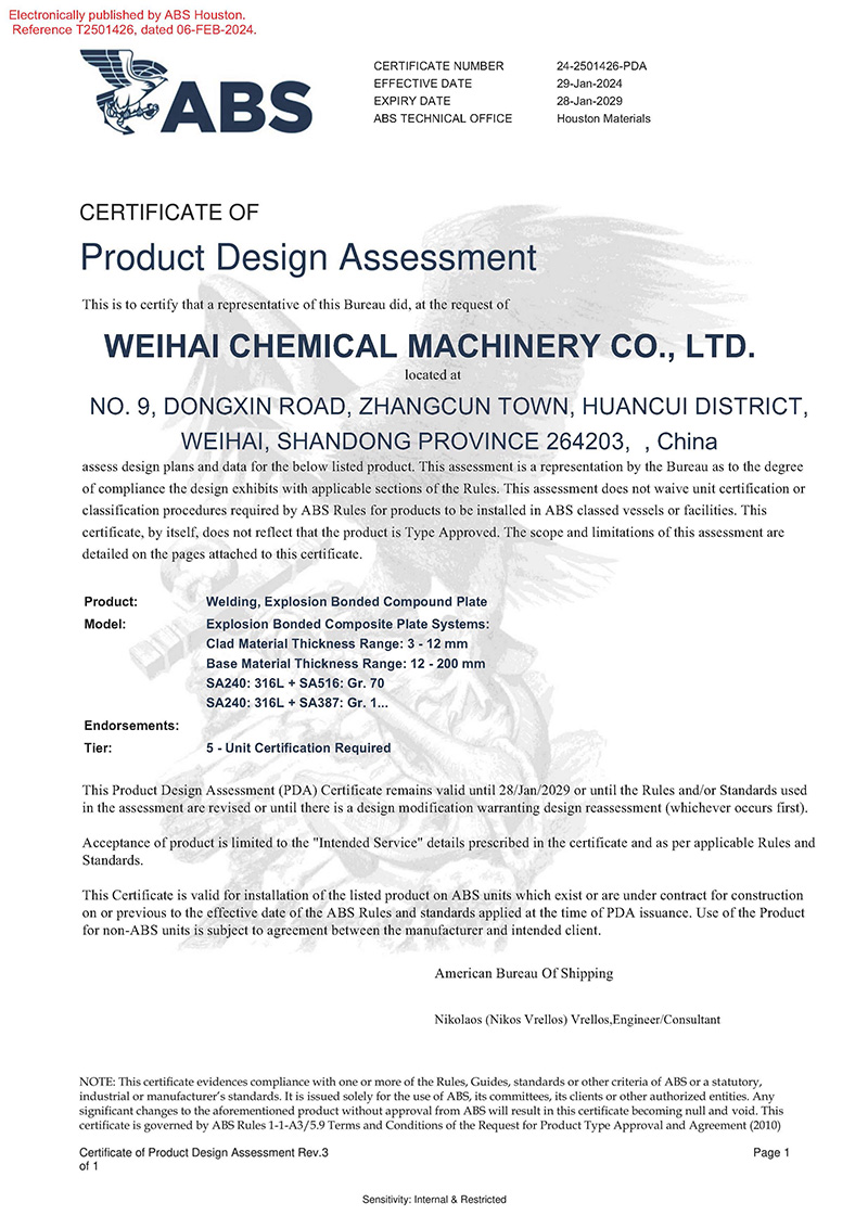 2024/04/17 查看詳情近日,威?;瘷C順利獲得美國船級社(ABS)頒發(fā)的產(chǎn)品設計PDA認可證書,認可產(chǎn)品名稱為“爆炸焊接復合板”,涵蓋產(chǎn)品種類:ASME SA264、ASME SA265、ASTM B898標準…