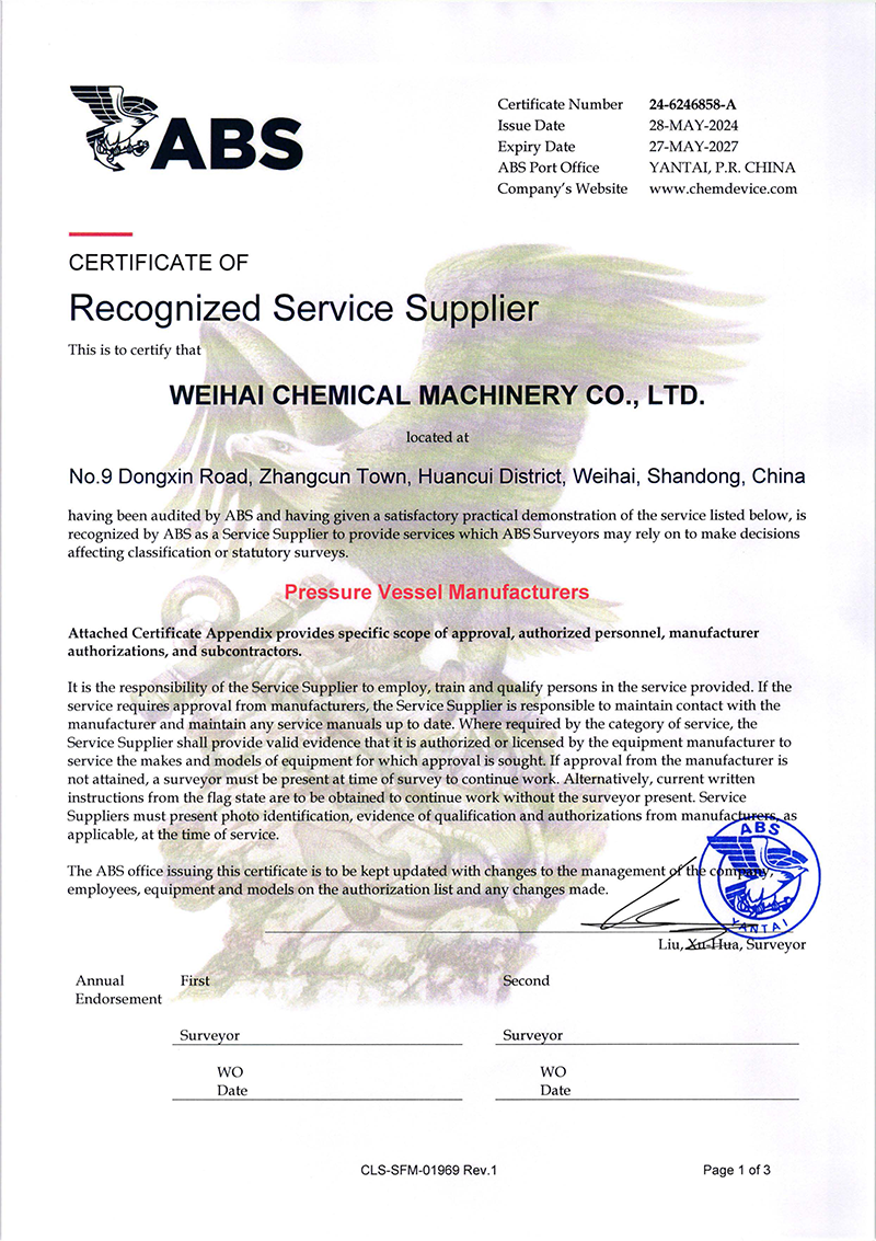 2024/09/15 查看詳情近日威海化工機械有限公司(以下簡稱“威?;瘷C”)壓力容器產(chǎn)品成功獲得了美國船級社(ABS)頒發(fā)的權(quán)威認證,是繼復合板產(chǎn)品ABS認證后拿到第二張ABS證書,這標志…